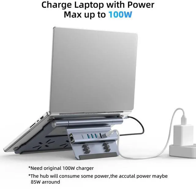 The docking stand comes with a PD IN port, delivering up to 100W of power to charge your laptop efficiently. Due to internal power usage, the actual output may be around 85W.