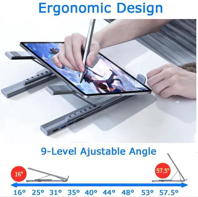 Ergonomic & Cooling Design 9 adjustable angles for optimal posture and comfort. The aluminum alloy frame and triangular support ensure stability, while the open design enhances airflow to keep your laptop cool.