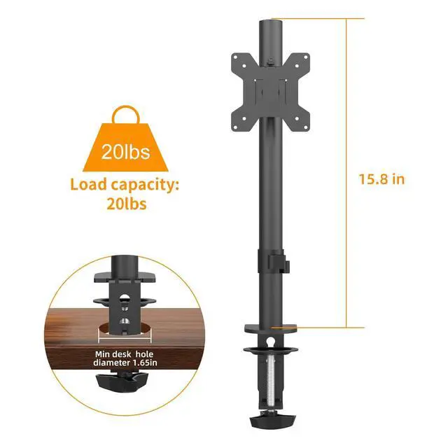 Single Display Universal Desktop Stand A desktop stand for 13 to 32 inch LED LCD monitors, with VESA dimensions of 75 x 75 mm and 100 x 100 mm (distance between the 4 mounting holes on the back of the monitor). The load capacity of the desktop mounted monitor arm does not exceed 20lbs. Confirm VESA specifications, weight, and dimensions before purchasing.