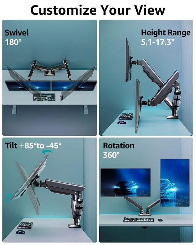 Our dual monitor arm offers full motion adjustment with +/-90° swivel, +85°/-45° tilt, and 360° rotation. Easily find the optimal viewing angle for both of your screens, enhancing productivity and comfort for gaming, entertainment, and essential work tasks.