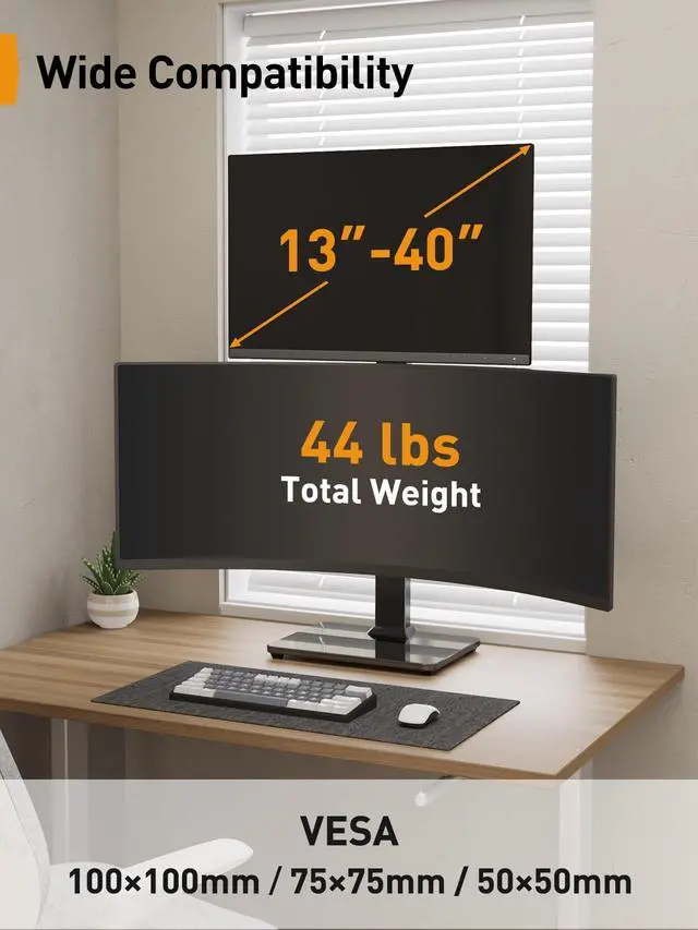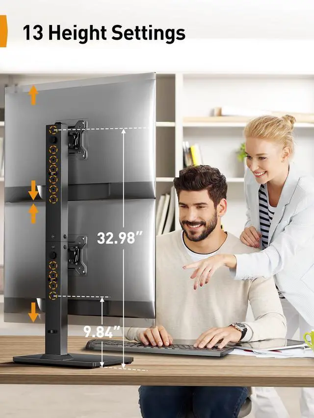 Vesa monitor stand has 13 levels of height adjustment, the max is 32.98''and the min is 9.84''. There are adjustment buttons for easy operation.