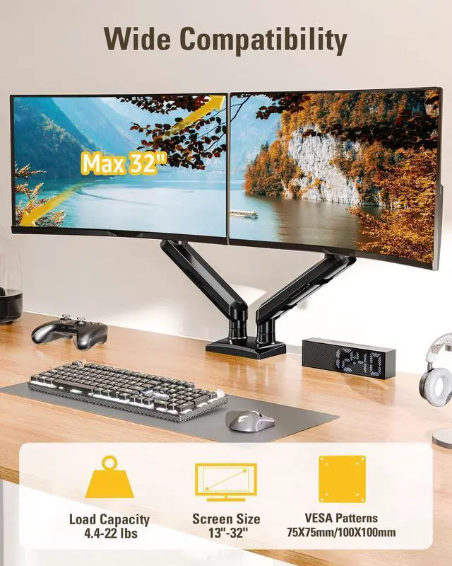 Compatibility: DreamAxis dual monitor desk mount fits most flat or curved LCD/LED screens from 13 to 32, each arm holds 4.4-22lbs, suitable for VESA patterns of 75x75mm and 100x100mm.