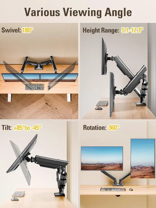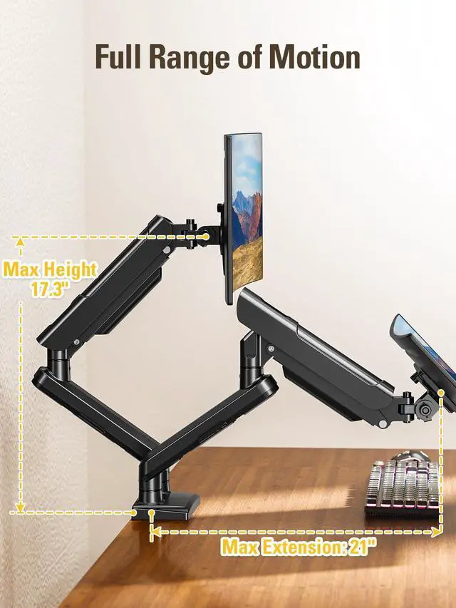 Full Motion Adjustment: Monitor arms with gas spring design allows you to extend your screen up to 21 and rise up to 17.3 in height. It also features +85°/-45° tilt, 180° swivel, and 360° rotation for landscape or portrait orientation, reducing neck and eye strain during long hours of use.