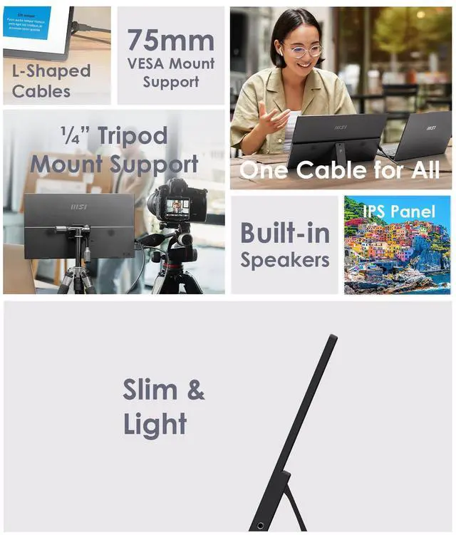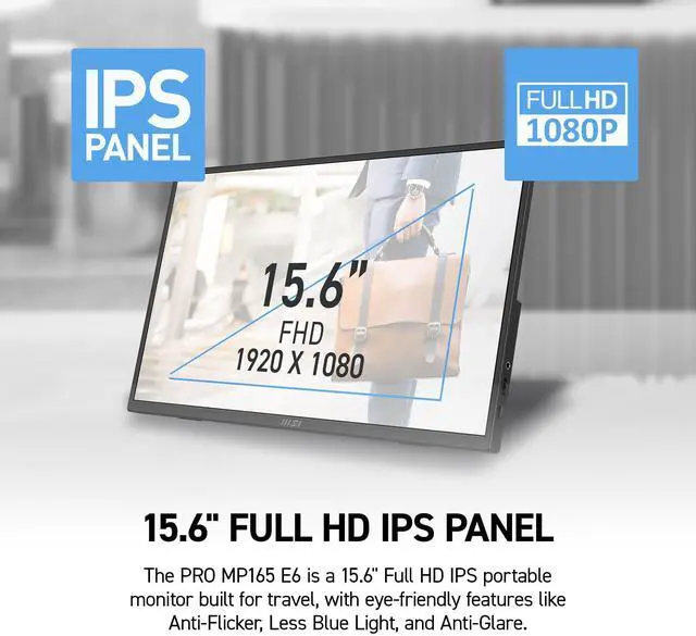 The PRO MP165 E6 is a 15.6" Full HD IPS portable monitor built for travel, with eye-friendly features like Anti-Flicker, Less Blue Light, and Anti-Glare.