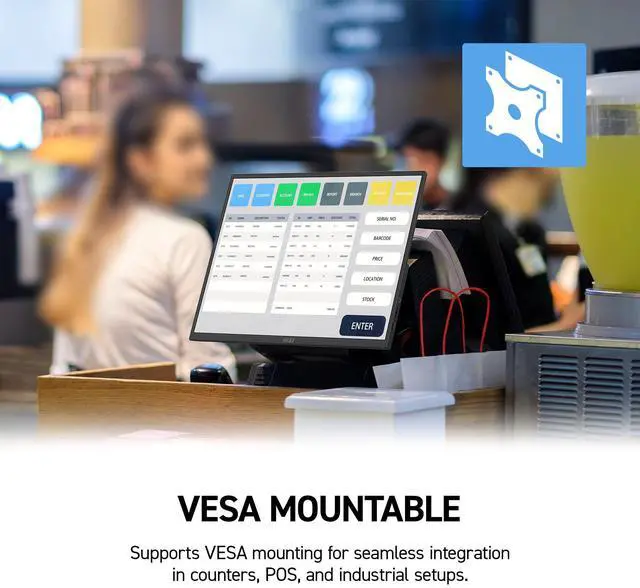 Supports VESA mounting for seamless integration in counters, POS, and industrial setups.