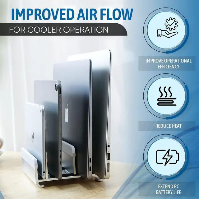 High-Capacity Device Storage (Up to 17.3"): Why settle for a standard 2 or 3 - slot laptop holder when you can organize up to four laptops and one mobile device in a single laptop vertical stand? Featuring three adjustable sliding brackets, our vertical laptop organizer for desk provides a secure fit for multiple devices, including heavy-duty gaming laptops up to 17.3". It is the ultimate laptop storage rack for multiple laptops.