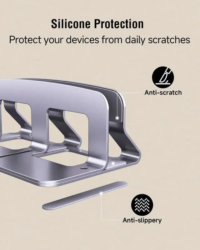Anti-Slip & Anti-Scratch: The desk laptop stand holder is covered with non-slip silicone pads inside the slot, perfectly protecting your PC from scratches. The base is also covered with silicone pads to avoid slipping or sliding
