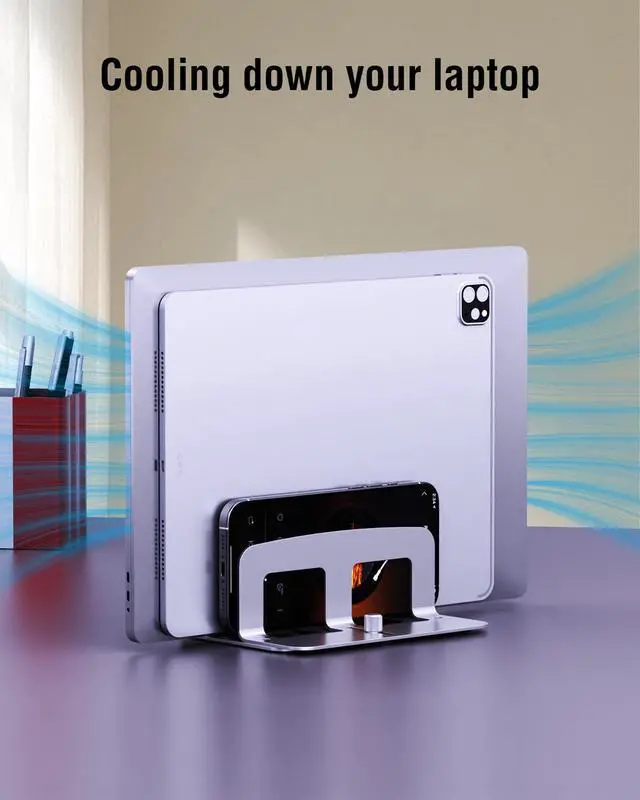 Space-Saving: The vertical laptop stand takes less desk space significantly compared to laying laptop flat. It effectively maximizes desk area for other tasks by holding laptop vertically for storage. A great tool especially when using monitor or keyboard