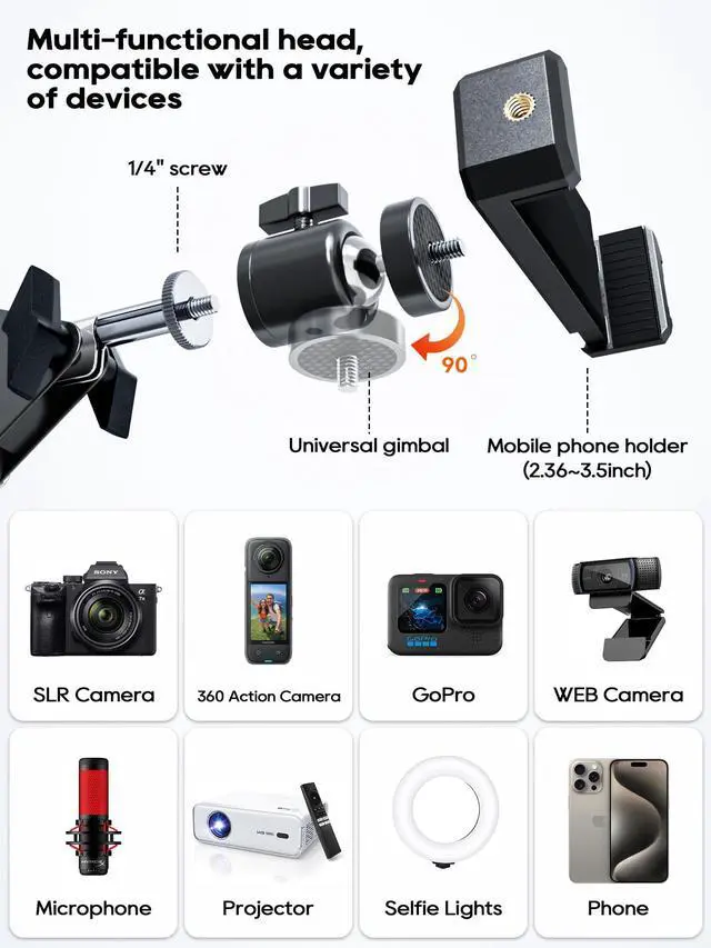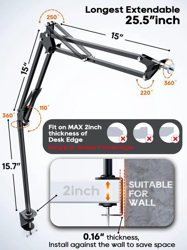 The desk clamp can be clipped to any desk up to 2 inches in thickness.