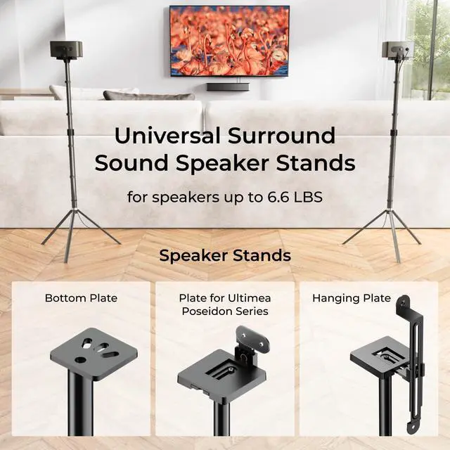 The speaker stand features three sturdy legs to prevent tilting and supports up to 6.6 lbs, ensuring stability on various surfaces, from hardwood to carpet. It's an ideal choice for any setup.