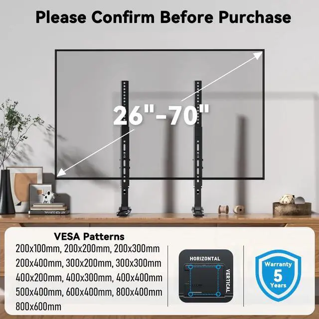 Universal TV Compatibility: This stand fits 22-70 inch flat or curved screens with VESA patterns from 200x100 to 800x600mm, compatible with major brands like Samsung, Sony, LG, and Vizio.