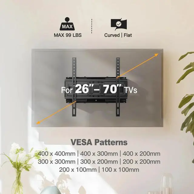 • Wide Compatibility: Designed for TVs from 26" to 70", fitting VESA patterns from 100x100mm to 400x400mm, and supports up to 99 lbs.