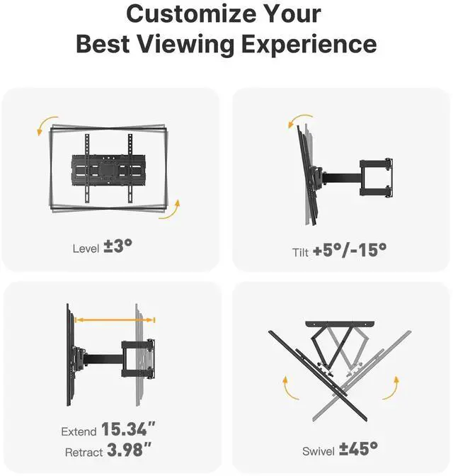2. Viewing Flexibility: Full-motion mount with 45° swivel, 5° upward tilt, 15° downward tilt, and 3° horizontal adjustment for optimal viewing angles.