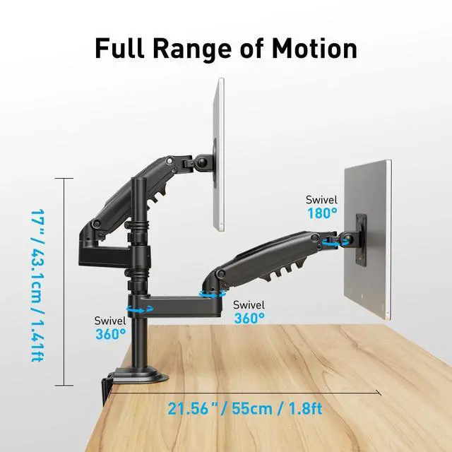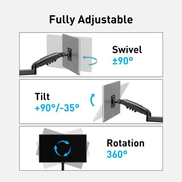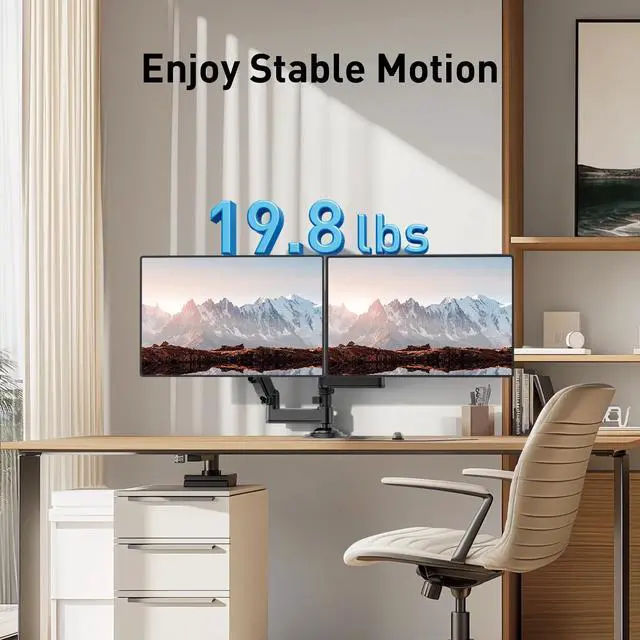 Customize Your Viewing Angle: This full-motion dual monitor arm offers 90° tilt, 180° swivel, and 360° rotation, allowing you to adjust your monitors for the perfect viewing angle to suit your needs.