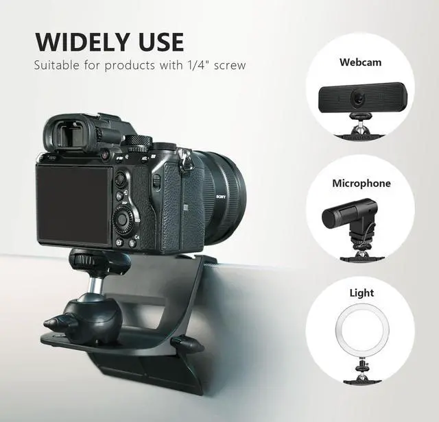 1/4 screw interface: This camera holder support include 1/4 screw interfaces. Can be adapted to cameras, webcams, microphones, lights, etc. of this size.