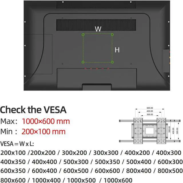 Compatibility: This TV Wall Mount fits most 80-120" TVs, supports up to 287lbs and fits a VESA 200x100mm / 200x200mm / 300x200mm / 300x300mm / 400x200mm / 400x300mm / 400x350mm / 400x400mm / 500x300mm / 500x350mm / 500x400mm / 600x200mm / 600x300mm / 600x350mm / 600x400mm / 600x500mm / 600x600mm / 800x400mm / 800x500mm / 800x600mm / 1000×400mm / 1000×500mm /1000×600mm mounting pattern