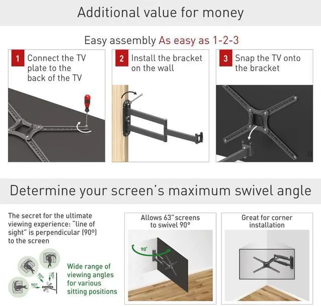 FUNCTIONALITY - To provide a better point of view, the mount s 3 pivots which: rotate near the wall 180°, fold 360°, swivel near the screen connection plate 180° in addition to a tool free tilt from -5° till 15°.