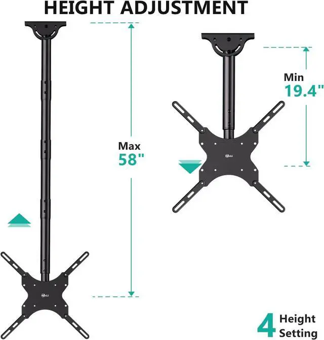Adjustment: Tilt down 25°, Left-right swivel range of 360°, Rotate both ways 3°. 2 Incremental Height Adjustment of 19.4 to 58 from ceiling to center of mounting plate for the perfect viewing angles.