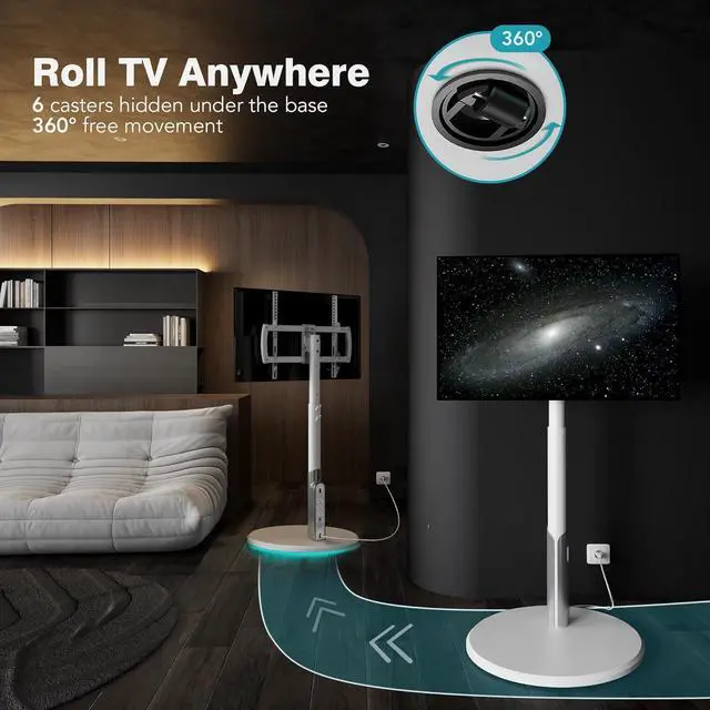 UNIQUE DESIGN: Mobile TV stand with invisible wheels on the bottom, additional ambient light on the bottom, and a convenient integrated power outlet on the back of the TV stand, including 2 USB ports, our portable TV stand is made using a steel construction and round chassis, designed to be carefully crafted to enhance its stability