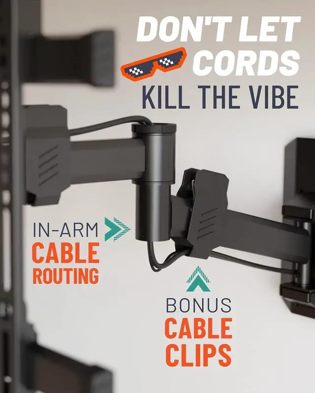 Wrangle up those dangling cords with the through-arm cable management and cable clips. Take it to the next level by adding on an Echogear in-wall cable management system.