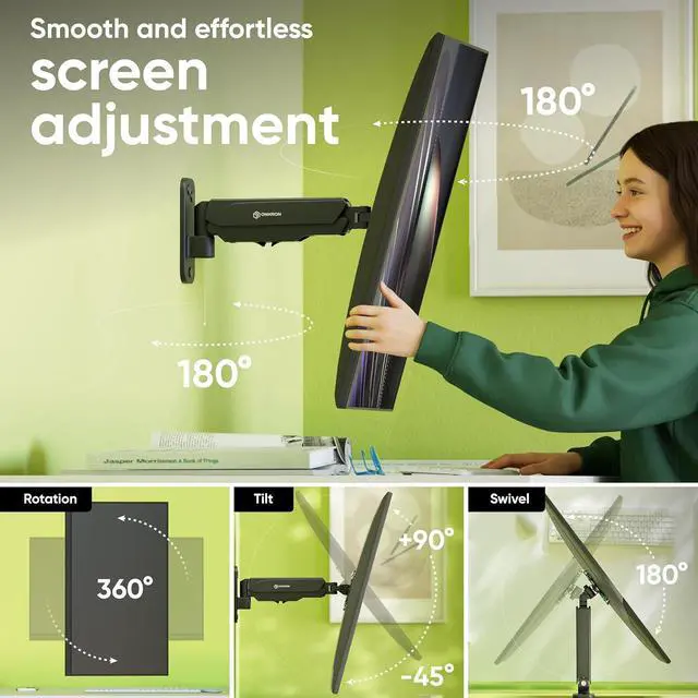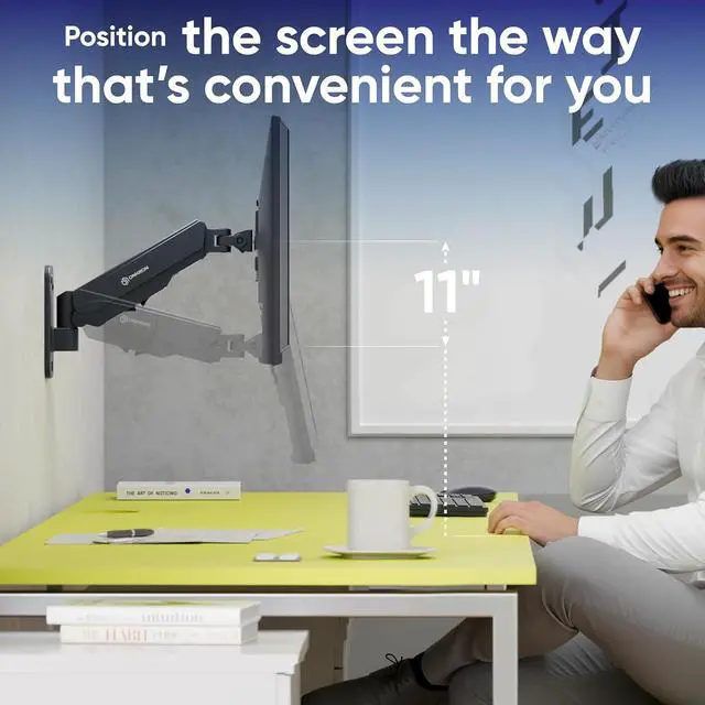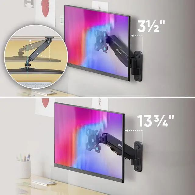 Full Motion Adjustment This wall mount monitor arm features smooth gas spring adjustment tested for over 50, 000 cycles. The computer screen wall mount allows height adjustment up to 11", extension from 3.5 " to 13.7 ", tilt from +90° to -45°, swivel 180°, and 360° rotation.