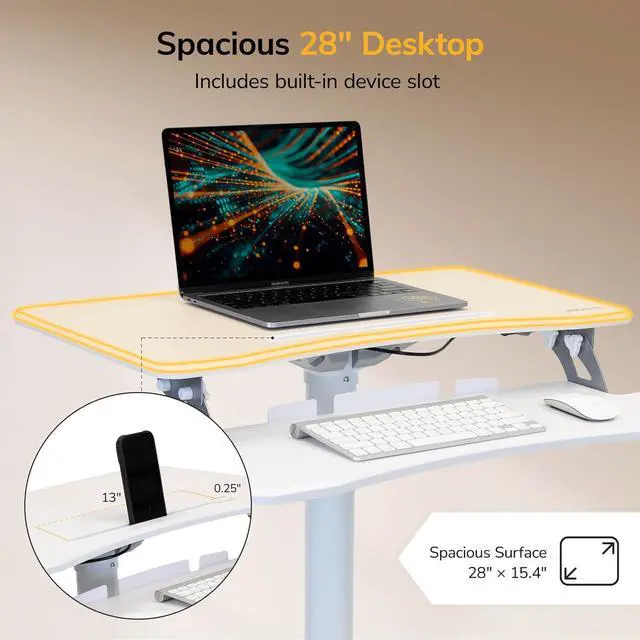 Spacious 28" desktop with integrated device slot The large work surface fits laptops, monitors, textbooks, and paperwork. A built-in device slot keeps tablets and phones upright for video calls, digital charting, or multitasking.