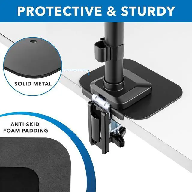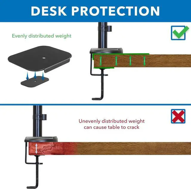 DISTRIBUTE WEIGHT EVENLY: The steel monitor mount plate reduces stress by evenly spreading weight, protecting desks from scratches and enabling support for heavy-duty setups.