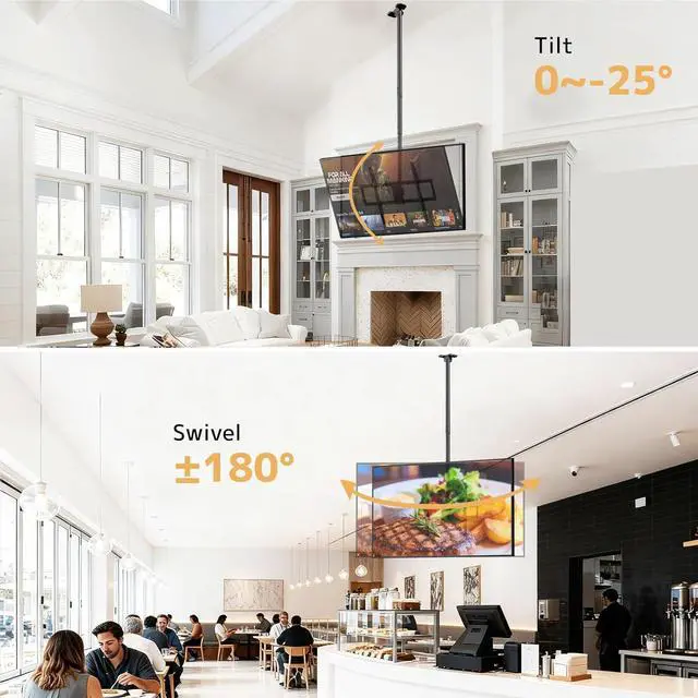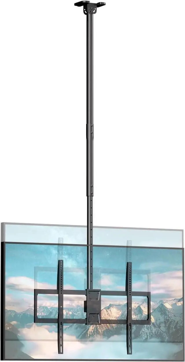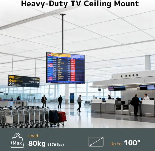Secure Ceiling TV Mount: Holds TVs up to 176lbs (80kg) with heavy-duty steel construction for maximum stability, ideal for 50-100 inch flat and curved TVs. Perfect for high-traffic areas like living rooms, gyms, and bars