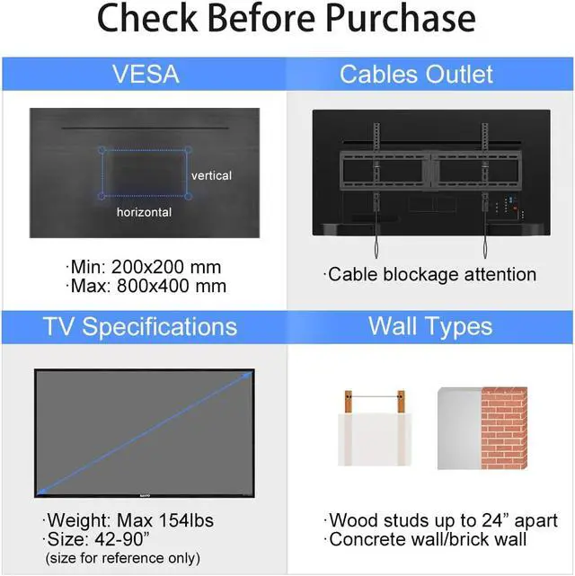 Safety & Pre-Installation Checklist Before purchase, verify your TVs VESA pattern, weight, wall stud placement, and potential obstructions (e. g., ports or outlets) for a seamless setup.