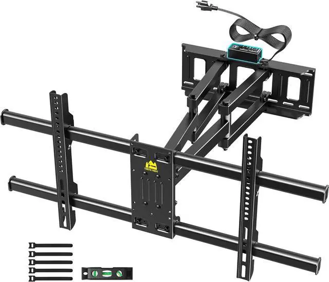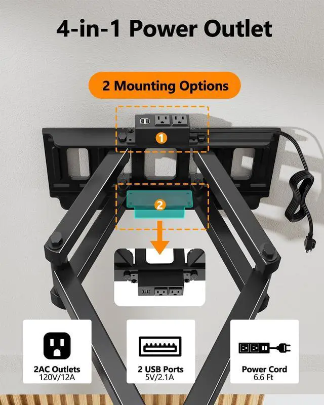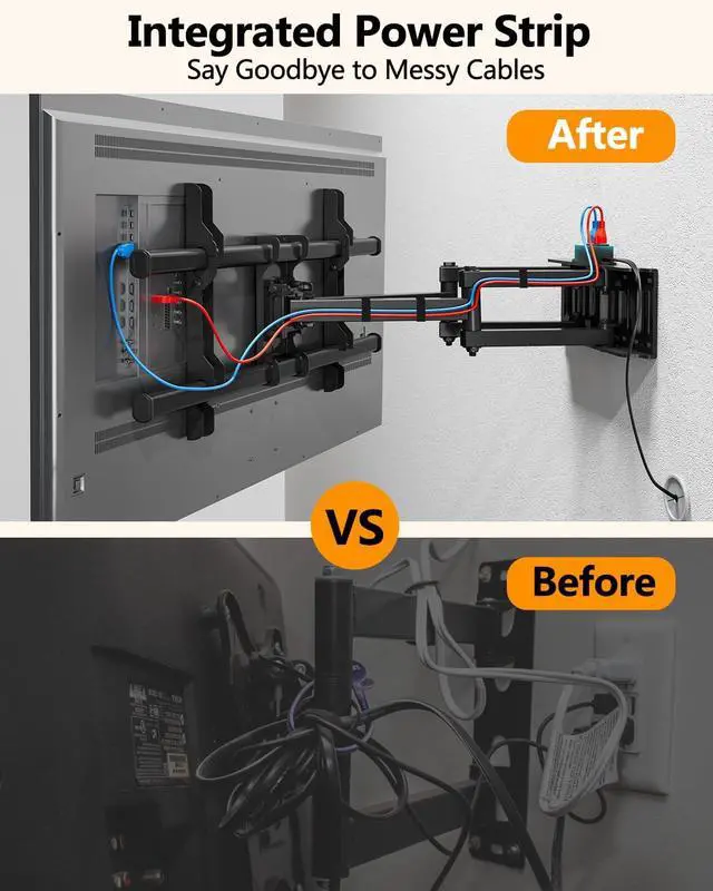 Upgraded Integrated Power Strip: FORGINGMOUNTs Dual Arm TV wall mount features a power strip that connects directly to the wall mount TV bracket. With 2 AC outlets, 2 USB ports, and a long 6.6 ft power cord, you can easily connect your TV, game console, or streaming device without the need for separate power strips to keep your entertainment neat and organized