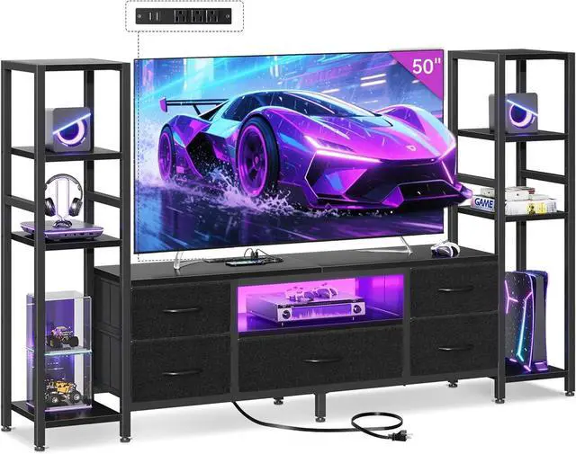 TV Stand with Storage Drawers & Open Shelves: Features 5 fabric drawers for hidden storage and adjustable side shelves for consoles, speakers, and décor. Keeps your living room or bedroom organized without taking up too much space.