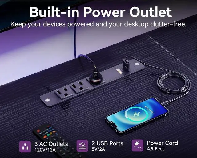 Entertainment Center with LED Lights & Power Outlets: Built-in 3 AC outlets and 2 USB ports power your TV, gaming consoles, and devices with ease. LED light strips with multiple colors create an immersive gaming and movie experience, perfect for modern entertainment setups.