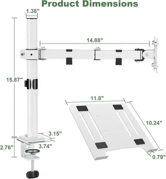WIDELY COMPATIBILITY - The laptop mount fits Laptop/Notebook up to 17", monitors up to 32" with VESA mounting holes 75x75mm and 100x100mm and supports weight up to 17.6lbs. The ventilated tray 11.8" x 10.4" is detachable and support you to switch between laptop and screens at will.