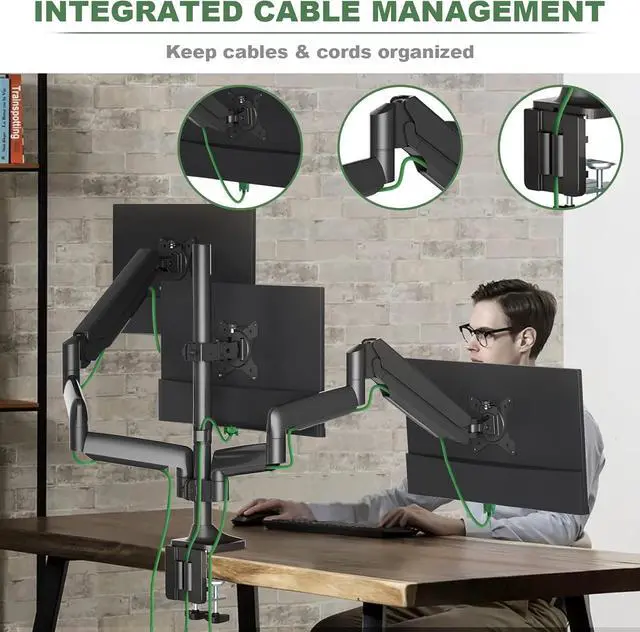 Uncluttered Appearance: Integrated cable management system helps hide any wires and cords, creating a clutter-free and neat work environment. It also has storage slots for the Allen wrenches for minor adjustments when needed. Gain more valuable workspace and enhance your PC setup with this triple monitor desk mount