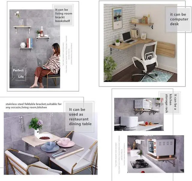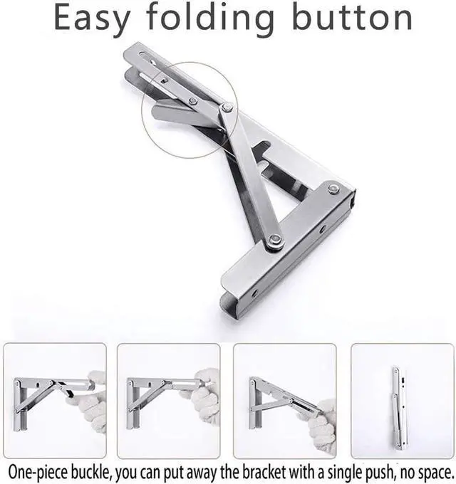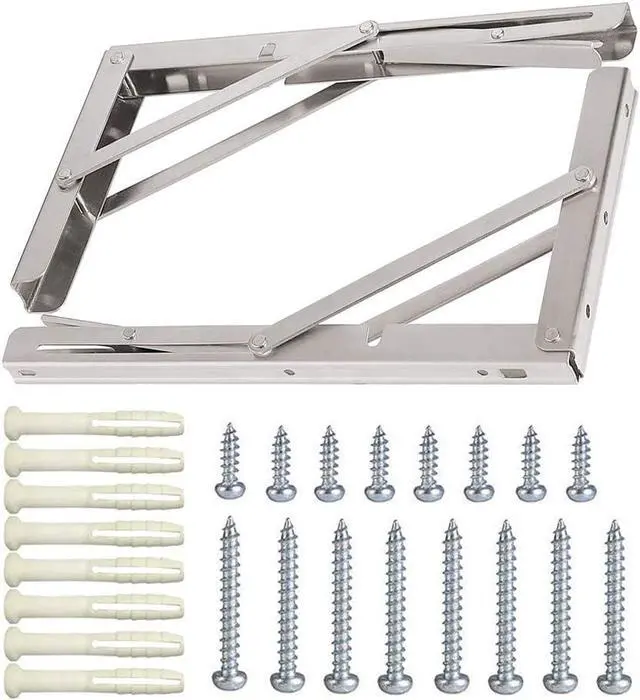 Stainless SteelMaterial: The folding shelf brackets are made of premium polished 304 Stainless Steel. Surface brushed treatment build to resist daily scratches corrosion and tarnishingSpace saving: The folding brackets are perfect for DIY jobs around the house. Excellent performance suitable for narrow spaces if you need a worktop that can be folded down and to the sideEasy installation: The folding hinge brackets are easy to mount and fold. Comes with the mounting accessories.