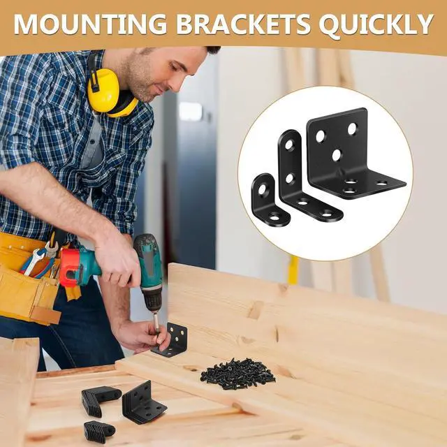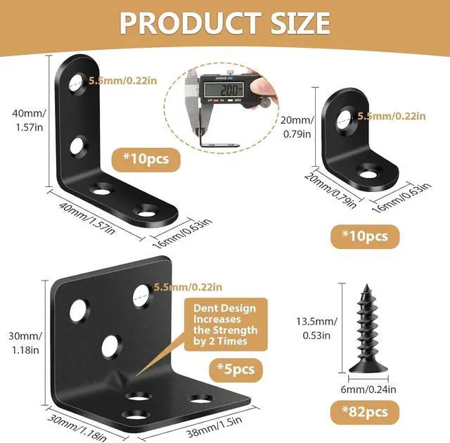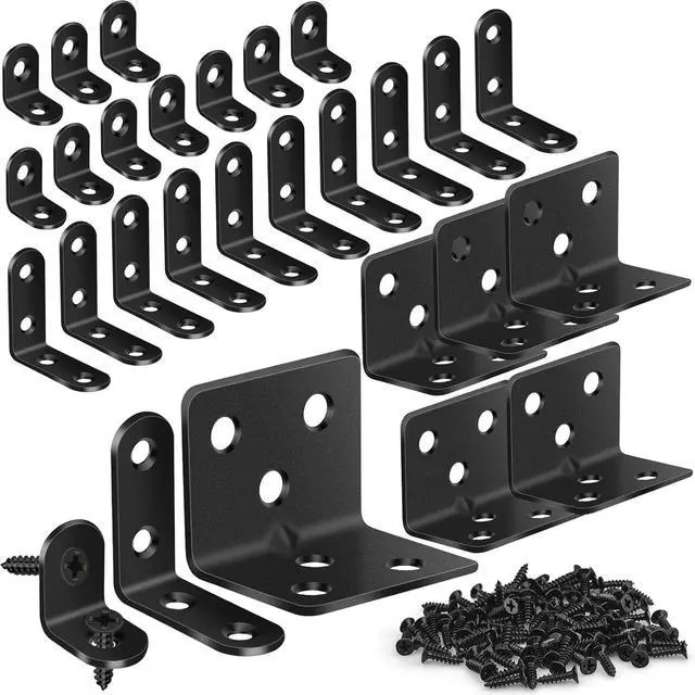 107PCS Value SetYou will get 5pcs l brackets heavy duty ( 1.18 x 1.18 x 1.5 in) 10pcs 4 holes l bracket ( 1.57 x 1.57 x 0.63 in) 10pcs 2 holes Small l brackets ( 0.79 x 0.79 x 0.63 in) 82pcs Screws ( 0.53 x 0.24 in). These angle brackets are numerous and 3 sizes making it easy to complete repairs on a variety of wobbly furniture! Sturdy & Durable & Anti-RustOur corner brackets and screws are made of high-strength Metal well-made strong bearing force not easy to break deformation. The surface is plated with multiple layers of black protective paint waterproof and rust-free smooth to the touch and good finish.