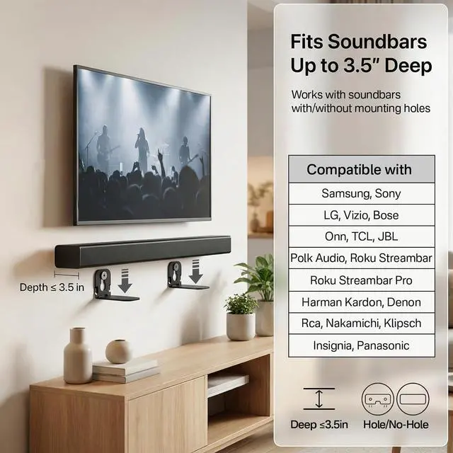 Wide Compatibility: This sound bar bracket is designed for ultra-slim soundbars with or without mounting holes. it compatible with Sony LG Vizio Bose Onn TCL JBL Polk Audio Streambar Streambar Pro Harman Kardon Denon Rca Nakamichi Klipsch Insignia Panasonic Hisense and more brand soundbars within 3.5 wide. Perect replacement for any soundbar mount under tv or soundbar shelf setup.