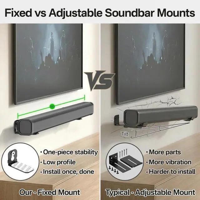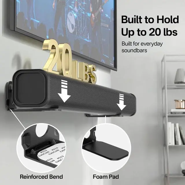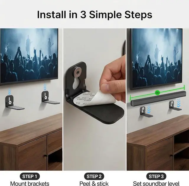 Anti-slip & Hold Firmly: To keep your soundbar securely in place our sound bar mounts under tv comes with strong adhesive which can prevent the soundbar from scratches sliding and hold your soundbar more firmly in place. This sound bar wall mounts undet tv can provide worry-free entertainment for all to enjoy the safe & relaxing moments with your family & friends.