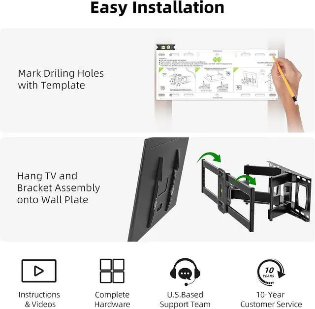 Designed for most brands: Insignia TCL Hisense LG Sony and etc? FULL MOTION & STRONG ARMSThis TV wall mount swivel and tilt with dual articulating arms which could +5° /-15° tilt TV ±45° swivel TV (Max swivel angle depends on your TV) ±4° post-installation adjustment allows the perfect TV leveling. You can anytime adjust your TV angle and find the most comfortable and healthiest viewing position? SAVING SPACE & HEAVY DUTYThis full-motion TV mount bracket can pull out to 15.02 and retract back to 2.62 which saves valuable space and make your house look neater. The wall mount for TVs is made of heavy-duty steel by lots of advanced automatic machines? EASY INSTALLATIONWith just 3 easy steps easy to install this wall mount TV bracket on the wood studs or concrete wall with detailed instructions. USX MOUNT TV bracket with all mounting hardware in pre-labeled bags.