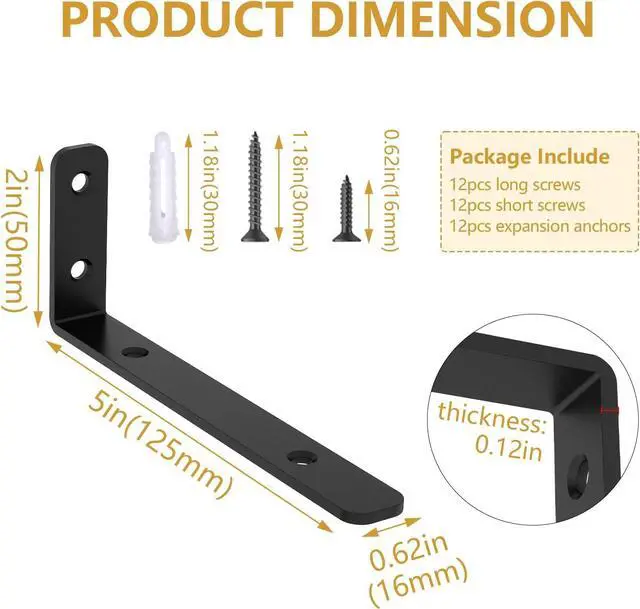 High Quality Metal: This heavy duty shelf bracket is made of high-quality solid metal steel coated with a matte black finish with a sleek and modern look. Rust-proof corrosion-resistant and smooth edges to prevent scratches during installation. Suitable for all kinds of DIY projects and long-term useL-Shaped StructureThe corner brace is designed in an L-shape with a perfect 90-degree angle strong structure more sturdy and not bend easily or deformation. Sinking screw hole design hidden screw installation more beautiful appearance.