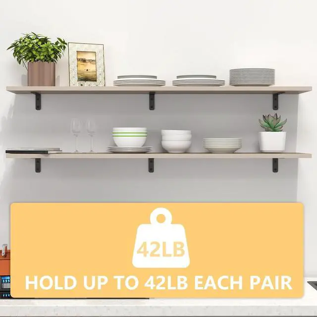 Max load: 42 lbs / 19 kgWide ApplicationThis small and sturdy L corner bracket is strong enough to be used for any shelf support bracket installation furniture wall shelves etc. such as bookshelves table shelves chair corners and garden shelves etc. Despite its small size these black shelf brackets can play a good role and can be used up or down to make your home or garden even more beautifulEasy to AssembleThe 6-pack wall shelf brackets come with screw accessories and instructions. Easily install your favorite shelves in shops home offices bathrooms kitchens living rooms dining rooms bedrooms garagesQuality AssuranceOur corner braces are produced under high quality control with smooth surface and stable structure. If you have any problems with this floating shelf bracket please feel free to contact us