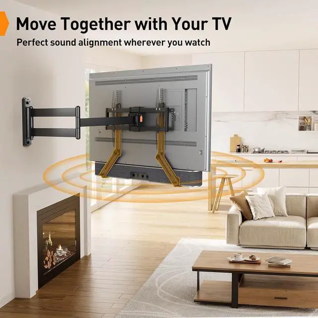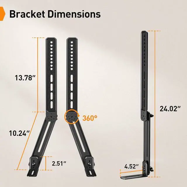 Height Adjustment: The soundbar mounting bracket under TV is designed with tool-free knobs which can rotate the bracket 360° and extend or retract the extension arms to help adjust the gap between the TV and soundbar or even adjust it to have no gap you can easily adjust at any time.