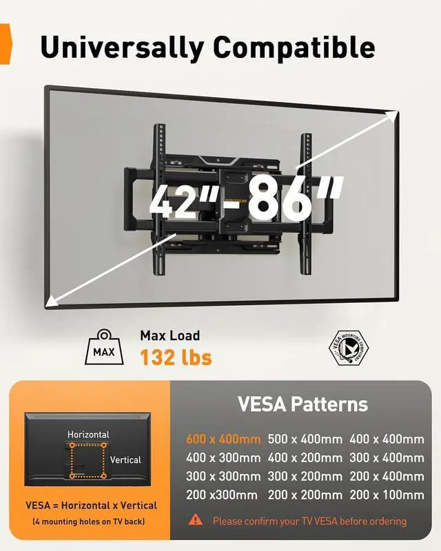 Strong & Solid: Featuring 6 articulating arms and heavy duty steel construction this 75 inch TV wall mount bracket is durable and safe and can hold up to 132 lbs. The upgraded wall plate is wider for more support while anti-drop end caps and security locks help to keep your TV in place.