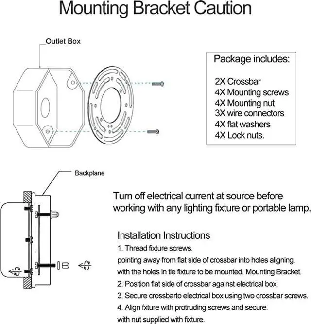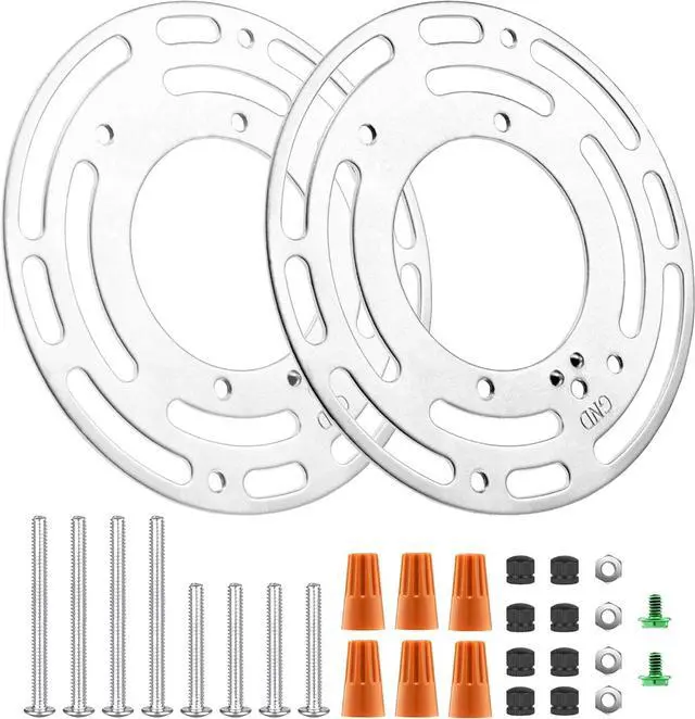 PACKAGE CONTENTS- 2 packs of steel universal light stand plates with all mounting hardware including grounding screws: 2 fixture crossbars 4 crossbar mounting screws 4 grounding screws 6 wiring nuts 4 black acorn cap nuts 4 silver acorn cap nuts. DURABLE MATERIAL- 2 sets of universal crossbars are made of high quality galvanized steel with 0.6 inch thickness durable and rust-proof to ensure your safe use and reliability for longer life. WIDE APPLICATION- This 4 inch light fixture mounting bracket adapter is designed for connecting light fixtures and canopies to electrical junction boxes. 2 pack can meet your multiple needs and is widely used for light fixture installation. You can use it to mount wall sconces near ceiling lights LED lights vanity lights and pendants bathroom vanity fixtures. EASY TO USE- The 4 diameter universal mounting plate fits most ceiling lights. Including grounding screws wiring nuts and crossbar mounting screws you can simply use it to mount the fixture without purchasing additional mounting hardware. OUR GUARANTEE- Please feel free to contact us for any support every customer will get the best service. We promise 24 hours customer support please feel free to contact us for any product and order questions.