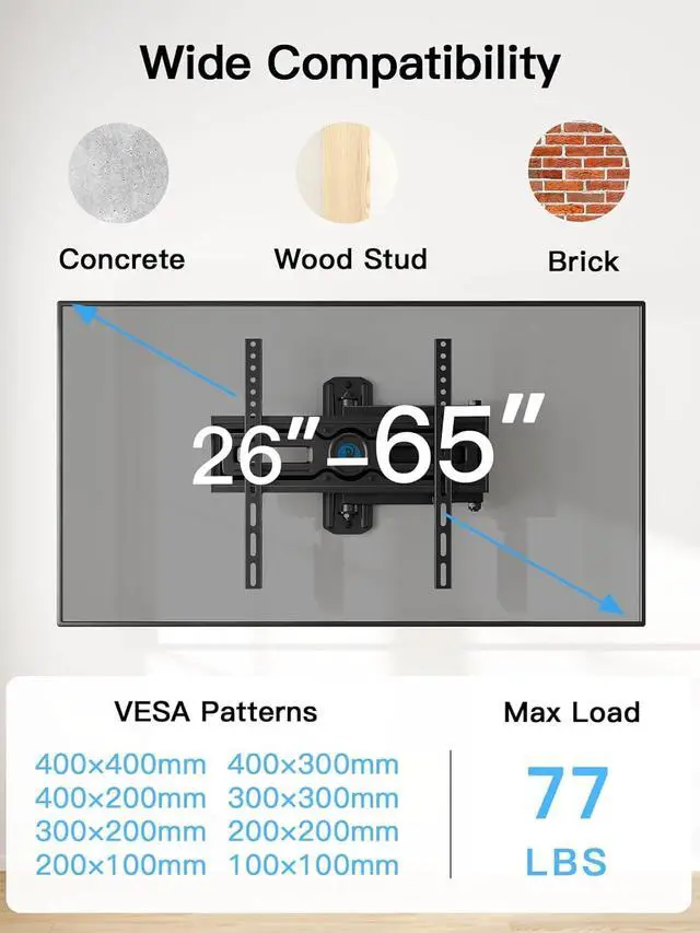 Wide Compatibility: This full motion TV mount fits most 26-65 TVs up to 77 lbs with VESA mounting patterns 100x100 to 400x400mm. Please verify the size weight and VESA pattern of your TV before purchase.