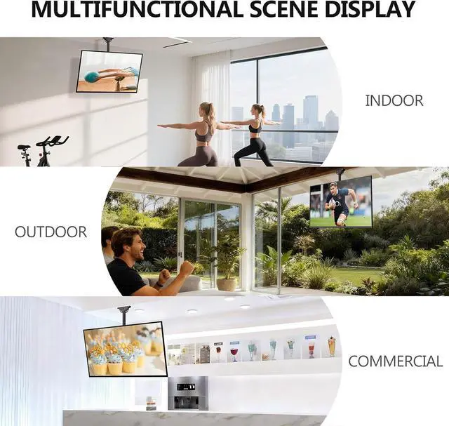 Supported mounting hole patterns: 400×400 mm (16×16) 300×300 mm (12×12) 200×200 mm (8×8) 200×100 mm (8×4) and 100×100 mm (4×4). Please check if the VESA and TV weight are suitable before purchase. Stable & Saving SpaceSteel and aluminum construction strength tested to support up to 110 lbs with ease you can rest assured that your TV is held safe and secure on this heavy-duty tv ceiling mount. It can be mounted on flat ceilings sloped ceilings vaulted ceilings or even 90° flat against the side of a joist. Compatible with wood stud concrete and brick wall mounting. Do not install the mount on drywall alone! Full Motion FlexibilityAdjustable ceiling mount tv bracket provides 2-inch incremental height adjustment ranging from 18.5 to 35.8 from ceiling to the center of the mounting plate ensuring the perfect viewing angle. The flip down ceiling tv mount can be tilted down 25° 360° left-right swivel and 3° rotation in both directions. Indoor & Outdoor UsePerfect for commercial use in restaurants coffee shops bars gyms grocery stores airports shopping malls fitness centers schools dental and medical clinics and department stores. The outdoor tv mount is also ideal for use in your home such as bedroom garage basement attic terrace patio gazebo back porch or fireplace.