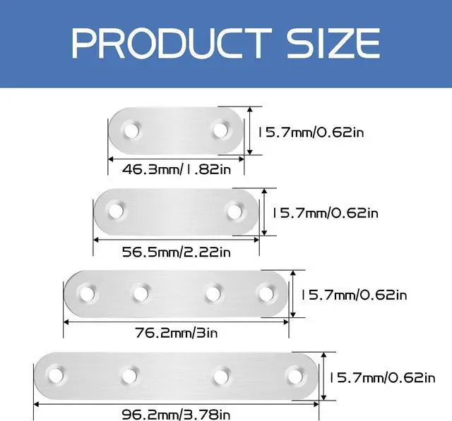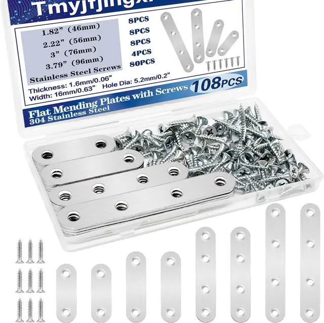 Reliable material: The flat mending plates with screws are made of 304 stainless steel which are waterproof and corrosion resistant can be used both indoor and outdoorStrong compatibility: The metal plate with holes are with 0.06 / 1.6 mm thickness and 0.63 /16mm width 4sizes length in a plastic box to meet your different needsEasy to operate: The brackets for braces are with smooth surface not easy to scratch hands and the kit comes with enough screws it is easy to install with themPackage include: 28sets straight mounting brackets including 8pcs 1.82 /46mm 8pcs 2.22 /56mm 8pcs 3/76mm 4pcs 3.79 /96mm length mending plates and 80pcs screws 108pcs totallyApplications: Our flat mounting brackets can be used for reinforced wood furniture such as bed desk table chair cabinet. etc