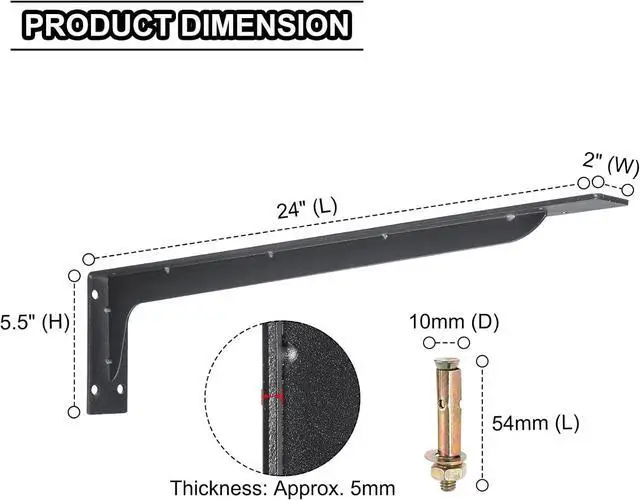 WHAT YOU GET - Our package comes with 4 x shelf brackets (24 L x 2 W x 5.5 H); 16 x expansion nails 10mm x 54mm (D*L); long screws and short screws; We have 9 sizes available please check and measure your board width before your buy this brackets. (Wood board is Notcluded). QUALITY MATERIAL - Our shelf brackets are made of quality solid steel with a matte finish high intensity and durability which can support up to 110 lbs/pair when properly mounted on the wall. Each bracket is secured to be straight square and of exceptional quality.