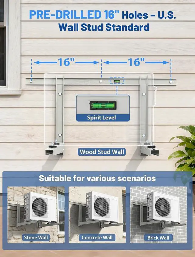 US Standard & Universal Compatibility: SMOQIO mini split wall mounting bracket measures 34.7 x 16.6 x 23.6 inches. The crossbar features pre-drilled holes to match U. S. standard 16 on-center wood stud spacing allowing secure installation on wood brick or concrete walls. Compatible with most mini split systems (600036000 BTU) making it ideal for both residential and commercial use.
