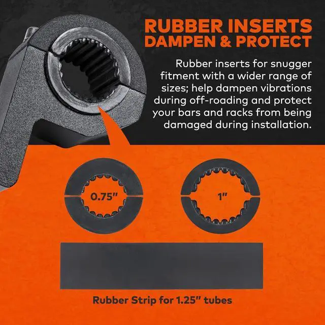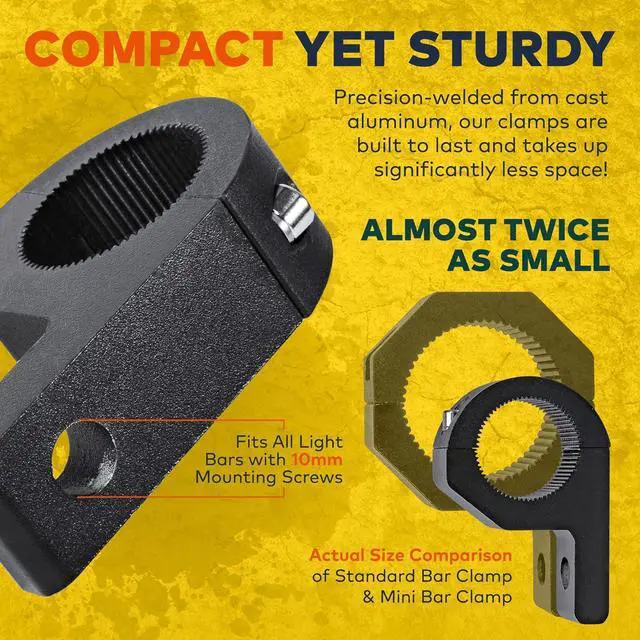 SMALLER SIZE - Ever have to jerry-rig your bar clamp over a smaller bar to make it fit? Not anymore. The Mini Bar Clamp is designed specifically for bars with a smaller diameter ranging from. 75 to 1 to 1.25. Mount your mini bar clamp on roof racks roll cages bull bars handlebars and more! The mini bar clamp takes up less space than traditional bar clamps allowing you to mount it in tighter spaces. RUBBER TEETH - Unsatisfied with the grip of your current bar clamp? The Mini Bar Clamp comes with multiple rubber teeth which allows the mini clamp to get a more secure grip and fit handlebars of different diameters.